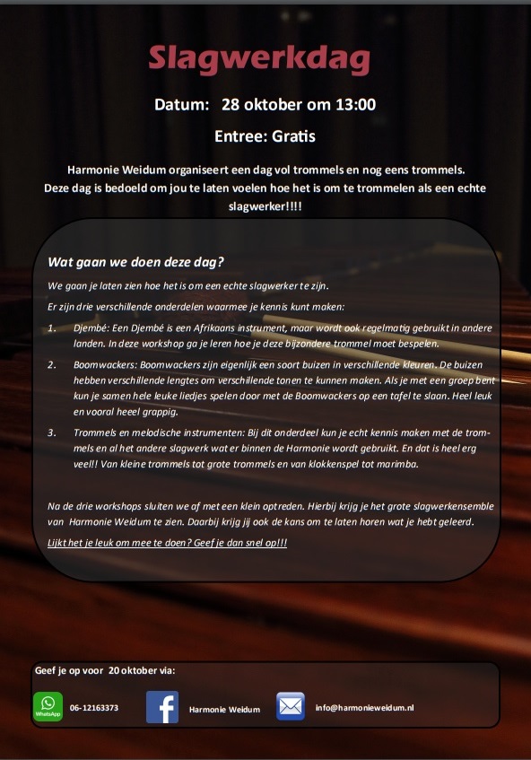 Zaterdag 28 oktober organiseert het slagwerk ensemble een slagwerkdag voor de jeugd vanaf groep 5. Er zullen 3 workshops worden gegeven en aansluitend een concert waarbij de jeugd kan laten zien wat ze gedaan hebben! De dag begint om 13:00 in het dorpshuis van Weidum en zal rond 17:45 afgelopen zijn.