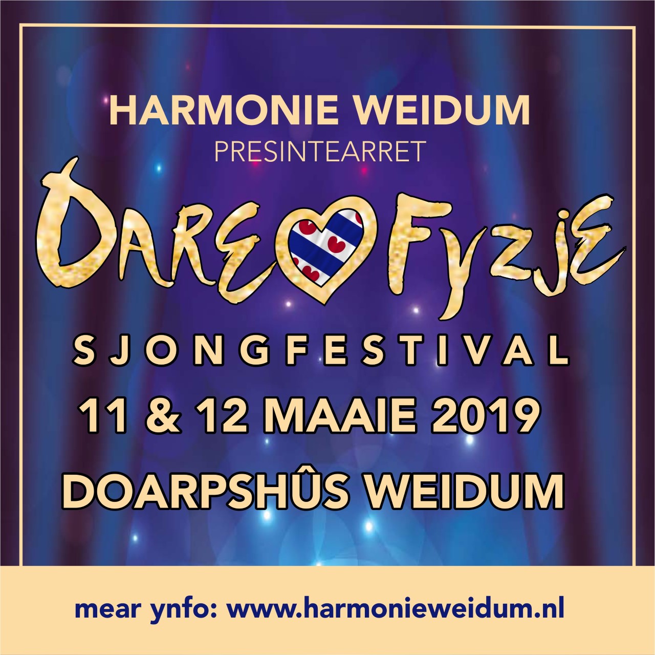 "Yn it wykein fan 11 en 12 maaie sil yn Weidum it Oare Fyzje SjongFestival holden wurde. De muzykferiening Harmonie Weidum, dy’t it organisearret, hat al hiel wat ûnderfining mei grinsferlizzende optredens lykas Weidum Slaat Troch, Koperdieven, Memories of a Nightclub en de bernefoarstellingen Hennie de Heks & Rôversguod."