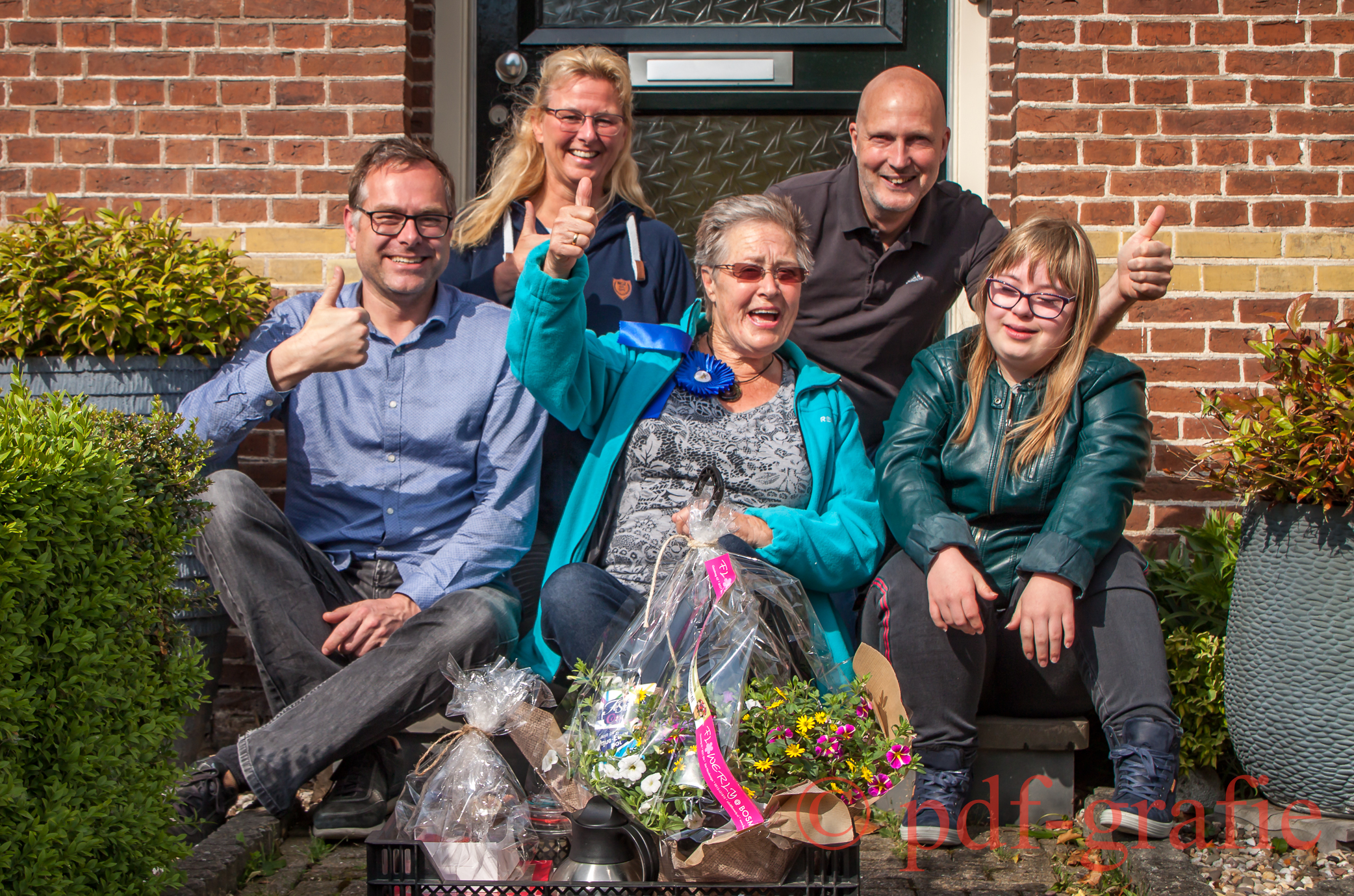 Sammelje by it Weidumer doarpshûs; Jellie, Sabine en Gjalt mei in skelter-karre fol lekkers, ús eardere Frijwilligers fan ’t Jier, de fotograaf en fanséls de oanbelangjende famylje.