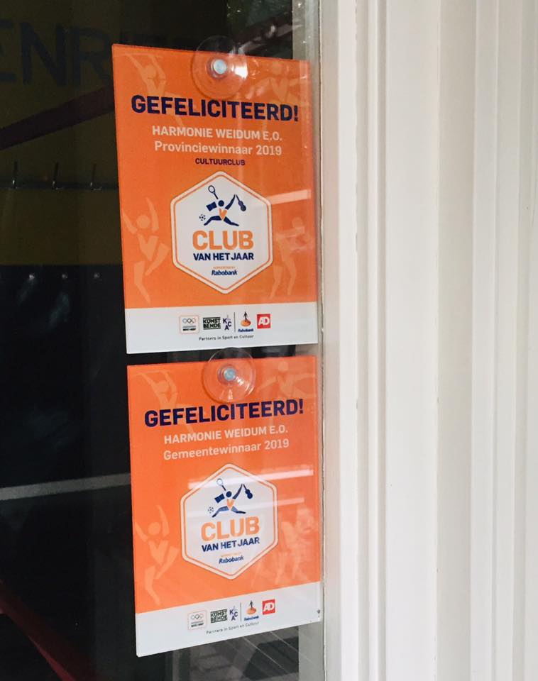 Tusken de ferskate merke-optochten troch, brocht de postboade in aardich kadootsje; ús plaquettes fan de ferkiezing Club van het Jaar! Fan no ôf oan hingje se te shinen yn it Weidumer doarpshûs!