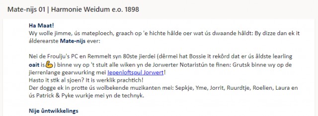 Wy wolle ús mateploech Maat fan `e Muzyk graach op 'e hichte hâlde oer wat ús dwaande hâldt: Dêrom krigen de measte Maten hjoed it alderearste Mate-nijs ever, besoarge troch in digitale do.