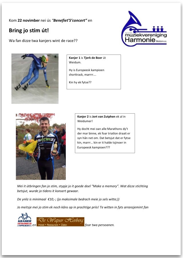 Tijdens het Benefiet'S'concert van Harmonie Weidum draait alles om beweging! Jort van Zutphen (allround atleet) neemt het op tegen de Europees Kampioen Shorttrack Tjerk de Boer, wie van deze kanjers weet de interactieve live race te winnen? Jij als toeschouwer kan inzetten op jouw Kampioen en wie weet sleep je zelf ook een prijs in de wacht!