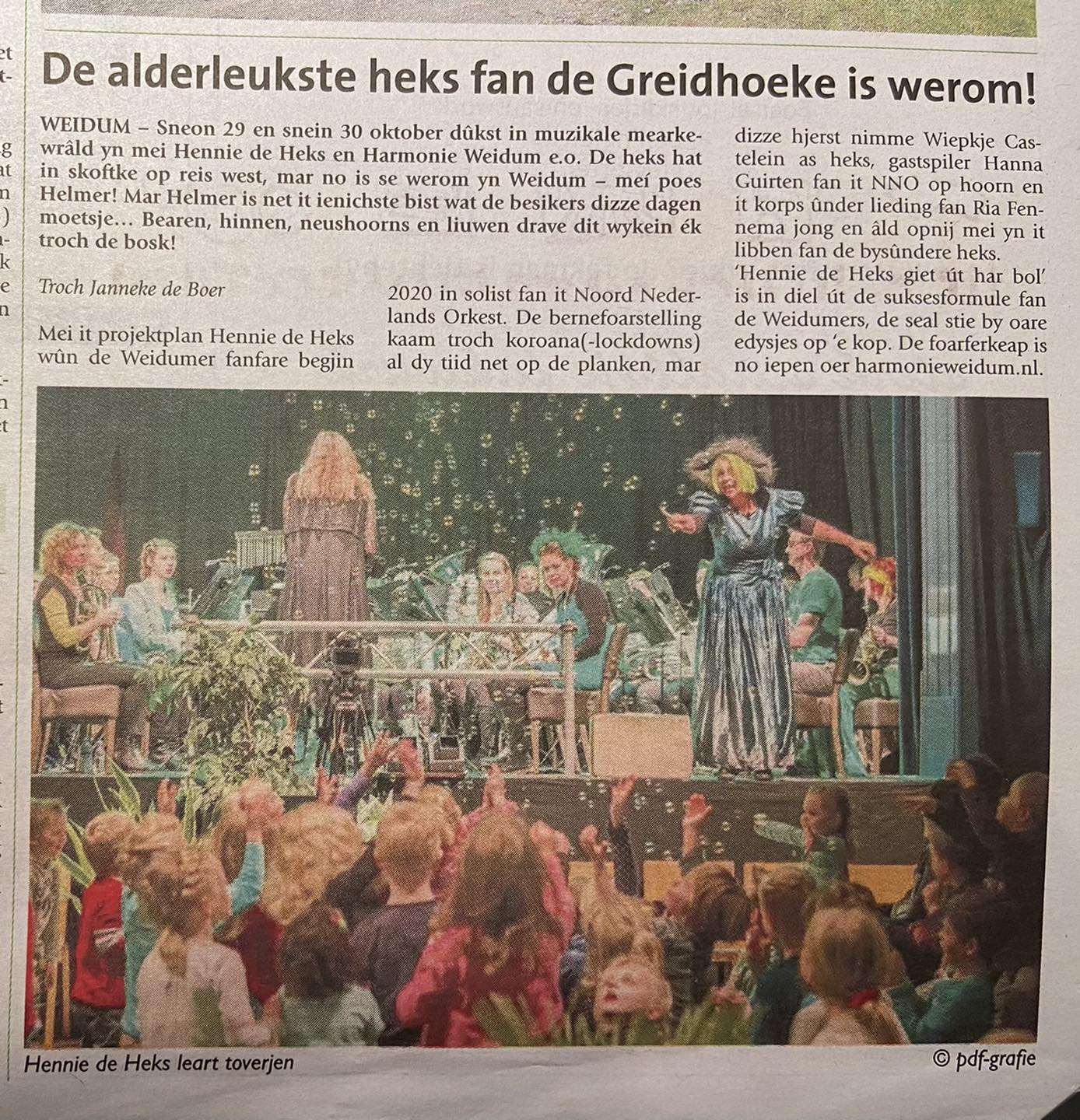 De alderleukste heks fan de Greidhoeke is werom! Sneon 29 en snein 30 oktober dûkst in muzikale mearkewrâld yn mei Hennie de Heks en Harmonie Weidum e.o.. De heks hat in skoftke op reis west, mar no is se werom yn Weidum – meí poes Helmer! Mar Helmer is net it ienichste bist wat de besikers dizze dagen moetsje… Bearen, hinnen, neushoorns en liuwen drave dit wykein ék troch de bosk! Mei it projektplan Hennie de Heks wûn de Weidumer fanfare begjin 2020 in solist fan it Noord Nederlands Orkest. De bernefoarstelling kaam troch corona (-lockdowns) al dy tiid net op de planken. Mar dizze hjerst nimme Wiepkje Castelein as heks, Gastspiler Hanna Guirten fan it NNO op hoorn en it korps ûnder lieding fan Ria Fennema jong en âld opnij mei yn it libben fan de bysûndere heks.