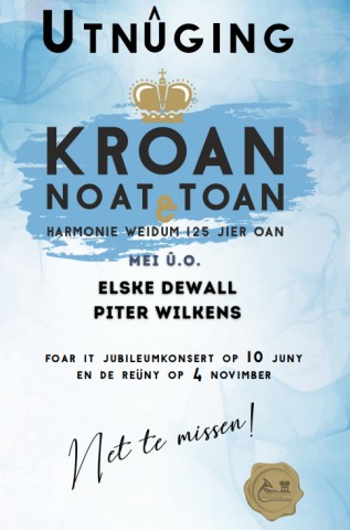 Op sneon 4 novimber hâlde wy in reüny foar de hiele feriening. Ferhalen, foto’s en in bysûndere film sille sjen litten wurde. Yn de film sjogge wy wat de Harmonie wie en hoe de takomst derút sjen sil, mar ek bylden fan de tarieding nei it jubileumkonsert en interviews mei bekende gesichten. In miel jûnsiten heard derby en jûns jout Harmonie Weidum e.o. in lyts konsert. Wy soene it moai fine as wy dy moetsje kinne! Nei opjefte folget der letter fia in e-mail ynformaasje oer in (lytse) eigen bydrage en it fierdere program.