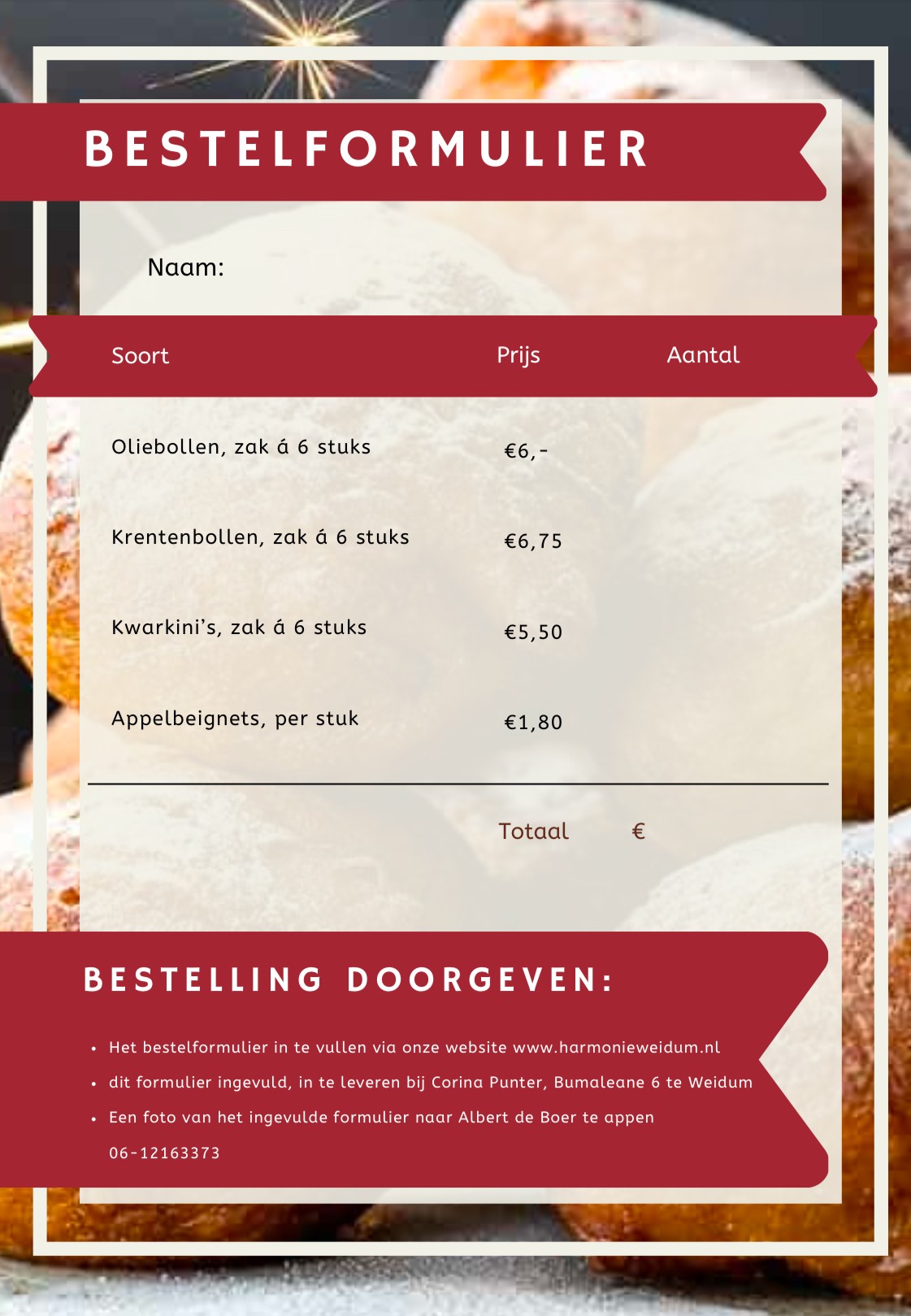 Het bestelformulier lever je in bij Corina Punter, of je plaatst je bestelling bij Albert de Boer via whatsapp: 06-1216 33 73.