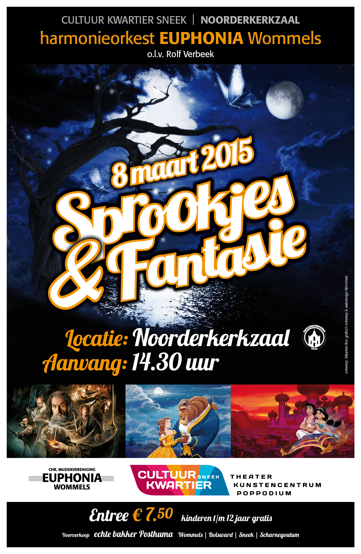 Zondagmiddag 8 maart a.s. speelt het harmonieorkest in de Noorderkerkzaal van het Cultuur Kwartier Sneek. Om 14.30 uur kan je met je ouders, opa en oma, broer en zus, oom en tante, buurman en buurvrouw genieten van een prachtig concert. Deze middag staat in het teken van sprookjes en fantasie. Velen kennen Aladdin, Belle en het Beest, Loch Ness en de Hobbits. Bekende melodieën hieruit zullen door de 55 leden van Harmonieorkest Euphonia Wommels onder leiding van Rolf Verbeek, ten gehore wordengebracht. Het concert is toegankelijk voor jong en oud en begint om 14.30 uur. Kaarten à € 7.50 (kinderen t/m 12 jaar gratis) zijn in de voorverkoop verkrijgbaar bij Echte Bakker Posthuma in Wommels, Bolsward, Sneek en Scharnegoutum of bij de leden van het harmonieorkest. Alles wordt die middag verteld en aan elkaar gepraat door Wendelien Kloosterman. Kom op tijd, want het aantal zitplaatsen is beperkt.