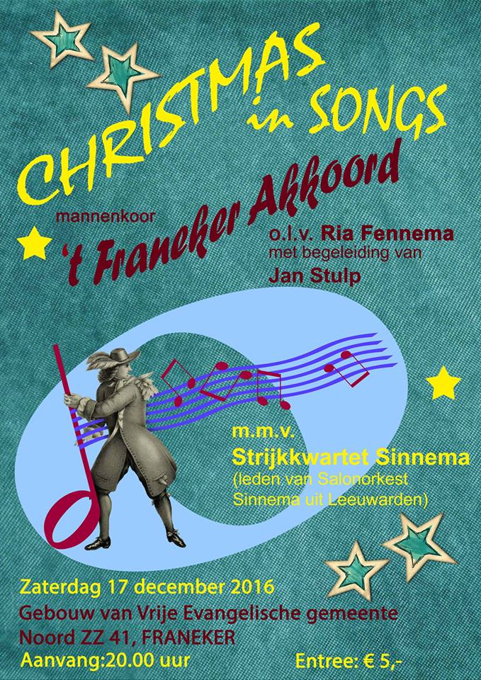 17 december 2016 om 20:00 uur in het gebouw van de vrije evangelische gemeente voeren de mannen van 't Franeker Akkoord "Christmas in Songs" uit. Een afwisselend programma met zang en instrumentele muziek m.m.v. Strijkkwartet Sinnema.